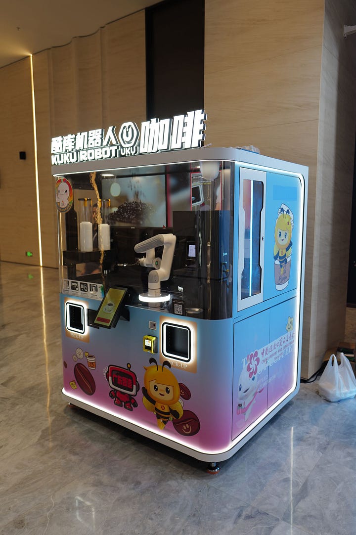 Robot baristas seem puzzling at first. A robotic arm operating a normal coffee machine is not obviously more efficient than a dedicated vending machine. But that may be the point. It is not only selling coffee; it is selling the experience of being served. In places where convenience and spectacle matter more than the ritual of a human-run café, this makes sense.