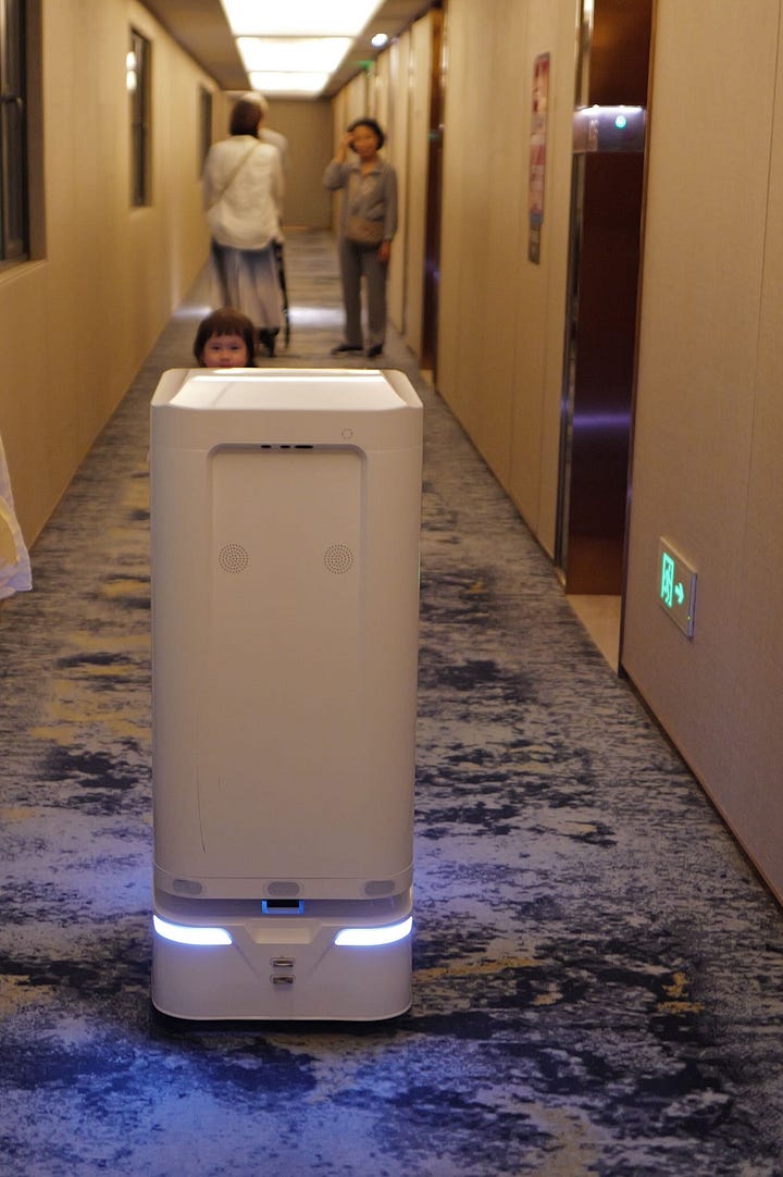 Delivery robots are very common in China and have become a well-developed industry of their own. If you are staying at a good hotel, you will likely see them. They are usually docked at reception. If you order food, instead of the delivery driver or hotel staff searching for your room, they place the order inside the robot, and the robot brings it to your door. Fast and efficient.