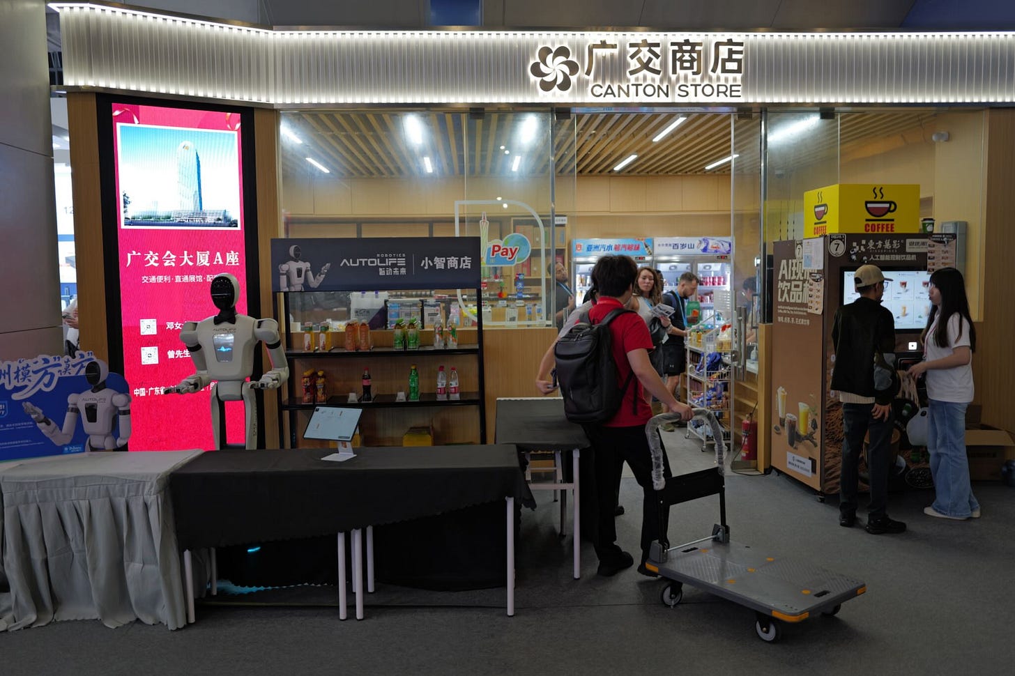If you are lucky, you can also run into more experimental applications, such as a robot sales assistant selling beverages at the Canton Fair. You order and pay at the touch screen, and the robot hands you the item.